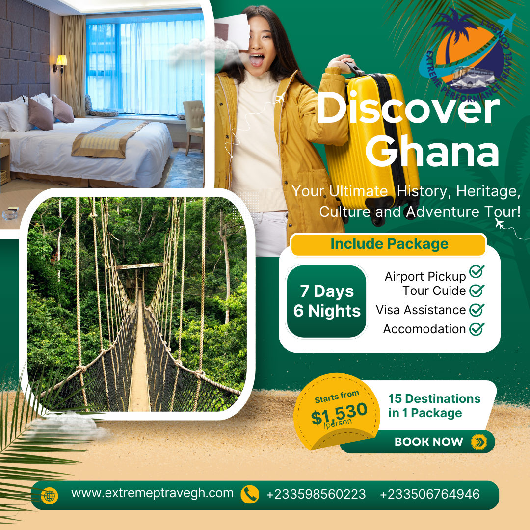 Embark on a carefully curated 7-day, 6-night tour covering Ghana’s Central, Eastern, Volta, and Greater Accra regions. Perfectly designed for first-time visitors and domestic tourists, this tour promises an extraordinary blend of history, culture, nature, and relaxation. Whether you are drawn to Ghana’s remarkable landmarks or eager to immerse yourself in its warm hospitality, this adventure checks all the boxes. From airport pickup to comfortable accommodations and an exciting itinerary packed with diverse activities, we ensure a seamless travel experience.